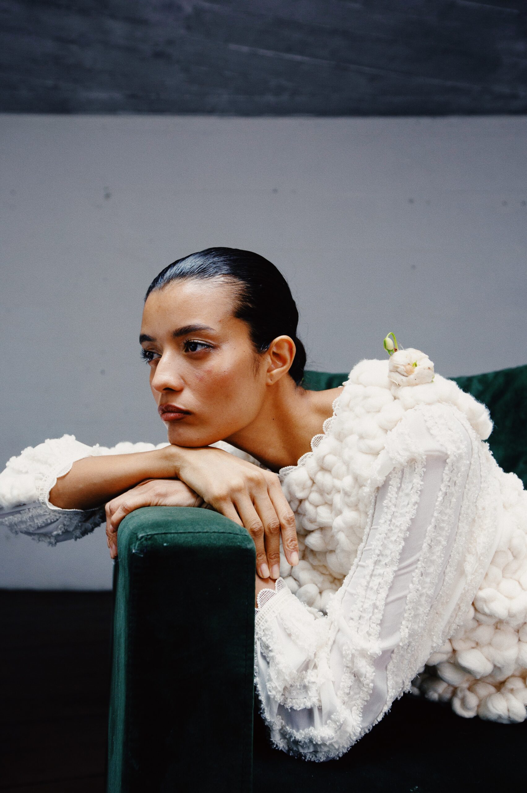 Um dos momentos mais simbólicos para nós foi o vestido construído com floquinhos de algodão ainda sem tratamento, aplicados manualmente, nó por nó. Ali, a matéria-prima deixou de ser apenas tecido e passou a ser linguagem. É essa capacidade de atravessar o tempo e assumir diferentes formas que nos interessa.